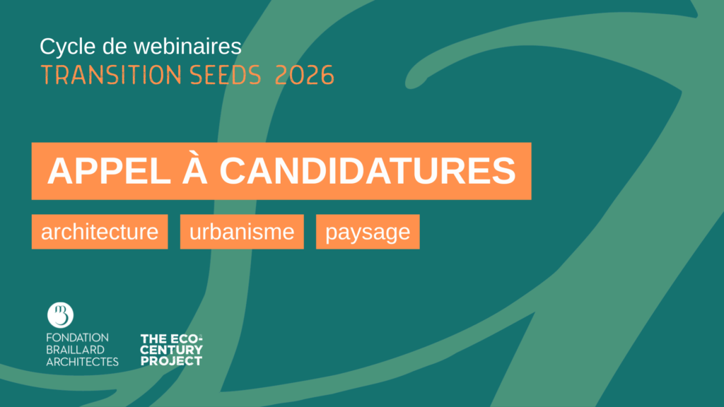 Pour la sixième année consécutive, la série de webinaires Transition Seeds revient! La Fondation Braillard Architectes lance son appel annuel à des projets de diplôme ou à des premiers travaux en architecture, paysage et urbanisme. Les approches, stratégies et propositions doivent s’inscrire dans le cadre de son programme de culture et de recherche The Eco-Century Project (ECP).